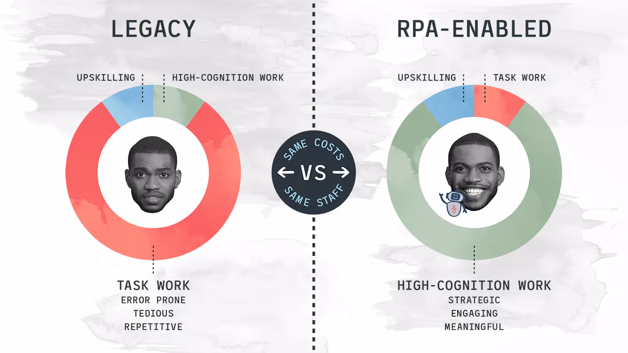 According to a Forbes survey, companies that adopted RPA saw a 92% increase in overall employee satisfaction. The results of this survey are noteworthy but not surprising, since automation enables employees to finally shift their focus from routine task work to creating a meaningful impact across the business. Employers will also benefit, as an increase in job satisfaction equates to enhanced engagement and lower turnover rates.
