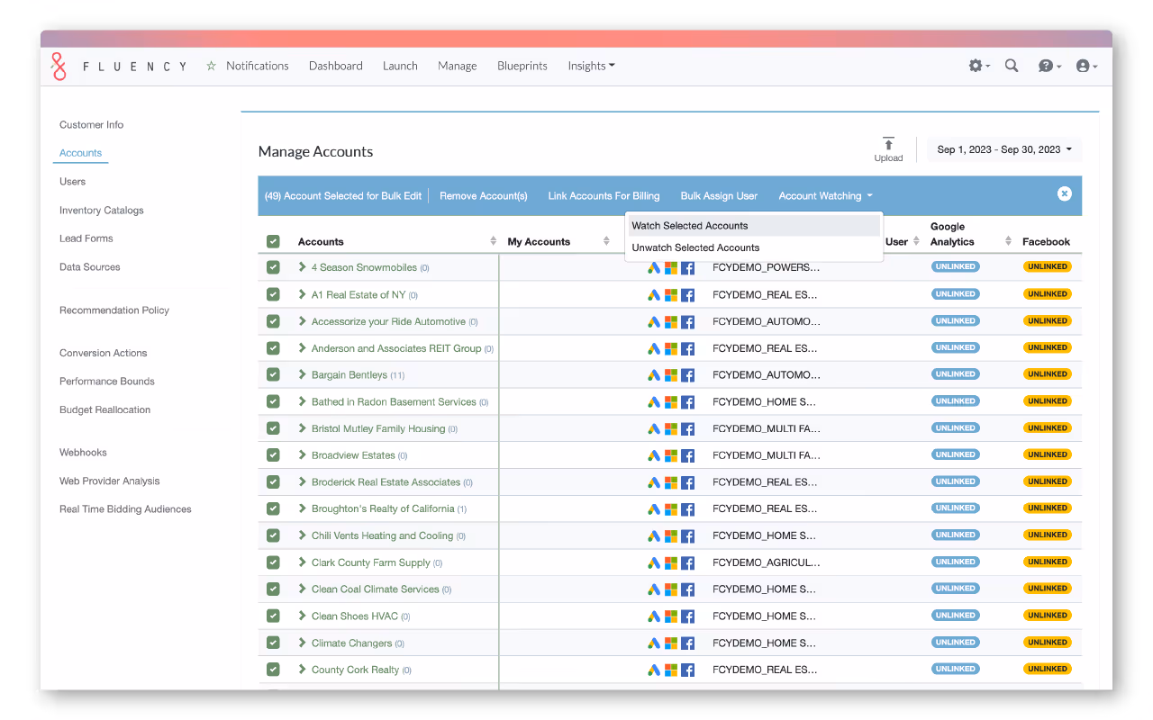 - Enterprise and Agency Management: Enterprises and agencies often manage a single business unit through multiple accounts, each specializing in different channels. For instance, one analyst might oversee a search account while another manages a social account. With Watched Accounts, the search account analyst can now easily keep an eye on the performance of the social account, fostering better cross-channel collaboration.