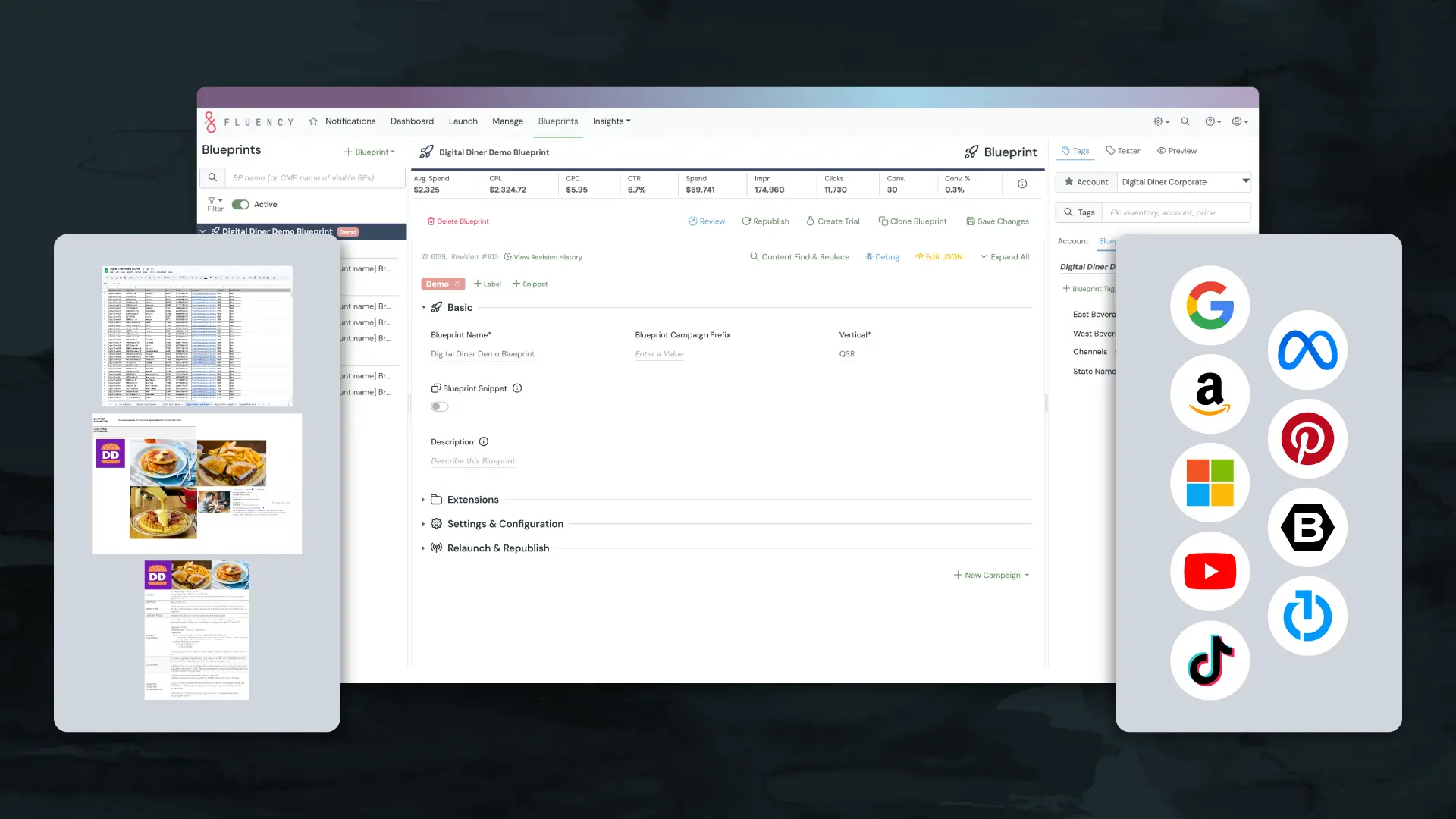 Blueprints dynamically connect your launch playbooks, campaign strategy, and account data to all major ad publishers, enabling real-time advertising management. Like a “digital workforce,” this capability allows you toautomate campaign execution and delivery at scale, for error-free management of the strategies you and your teams set.